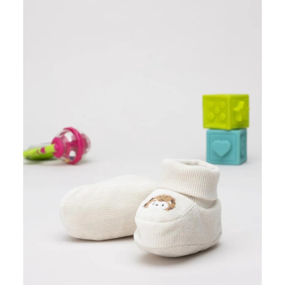 Tiernos zapatitos para bebé en color crema con bordado de leoncito en la parte frontal. Su puño suave en el tobillo garantiza comodidad y practicidad en el uso diario.