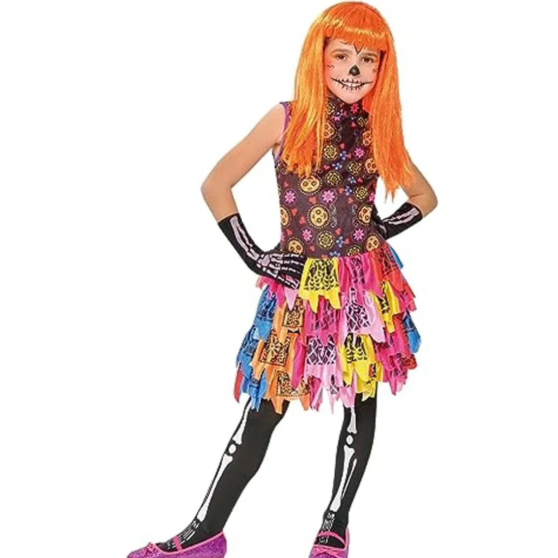 Este disfraz, inspirado en las tradiciones del día de los muertos, incluye un vestido de colores con detalles impresos, junto con unas medias y unos guantes que brillan en la oscuridad. El material del disfraz es adecuado para largas jornadas de diversión y viene debidamente empaquetado en su propia bolsa con percha para asegurar su buen estado.