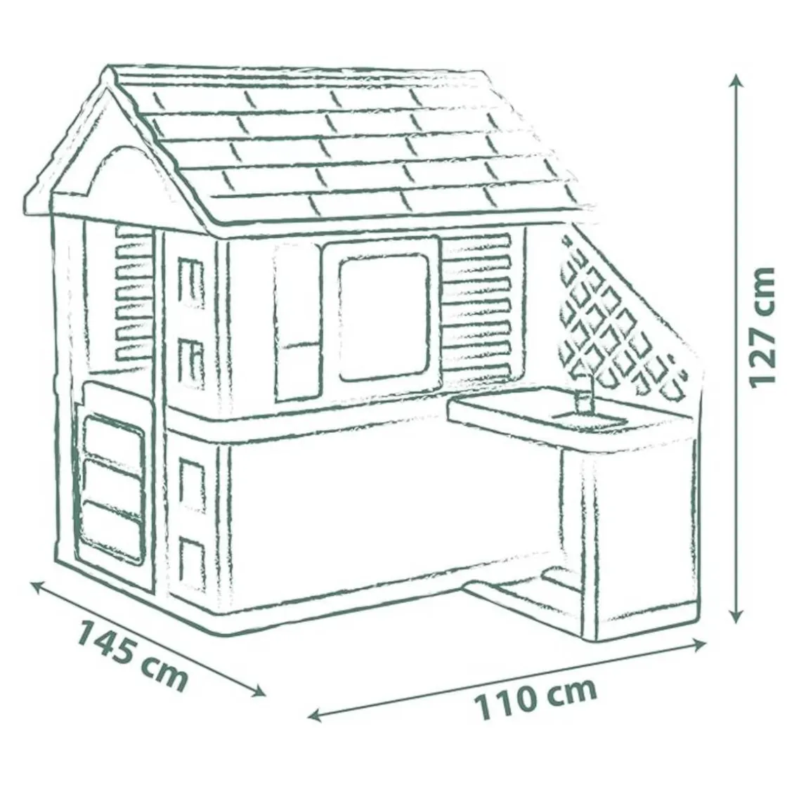 Cocina exterior integrada: Incluye una cocina de verano con fregadero, parrilla y 17 accesorios (vasos, platos, cubiertos, olla y salchichas), fomentando el juego de imitación y la creatividad.