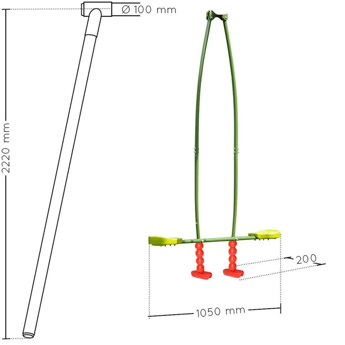 Capaz de soportar un peso máximo de 70 kg, (35 Kg por cada niño) este balancín se adapta a pórticos de 222 cm de altura.