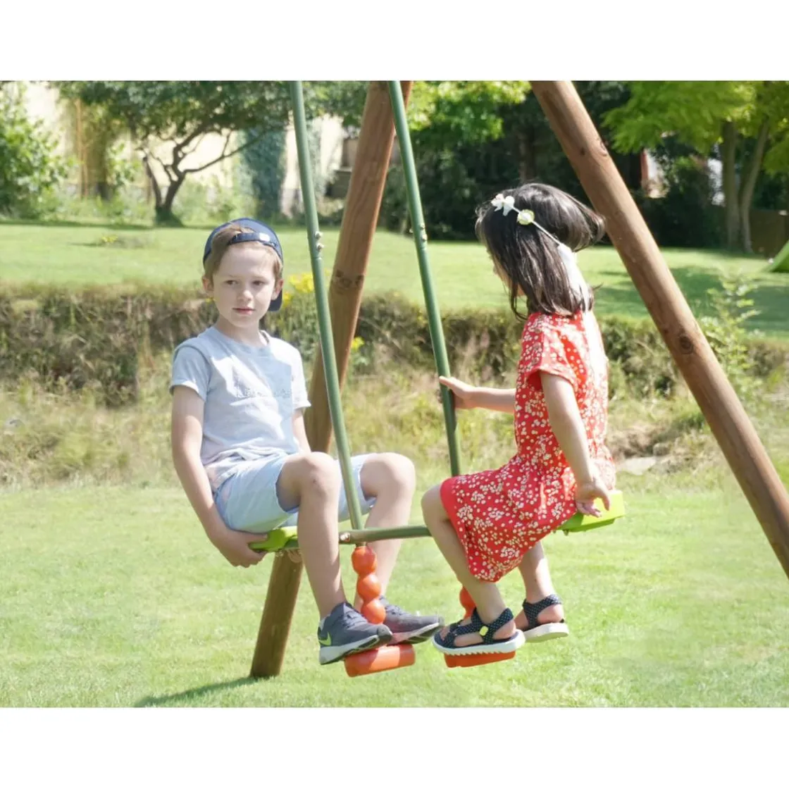 Un balancín de acero galvanizado con dos asientos de plástico que se integrará perfectamente en el exterior y permitirá que los niños de 3 a 12 años se balanceen a su antojo.