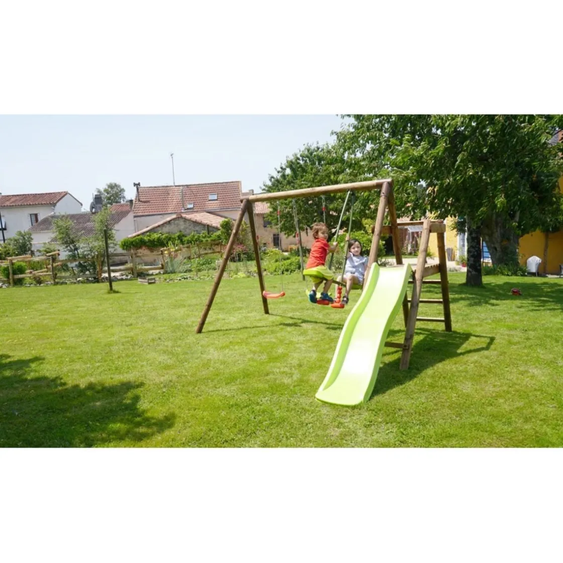 Se trata de un columpio de madera tratada con autoclave IV marrón. Es ideal para una casa con jardín, y para peques de 3 a 12 años.