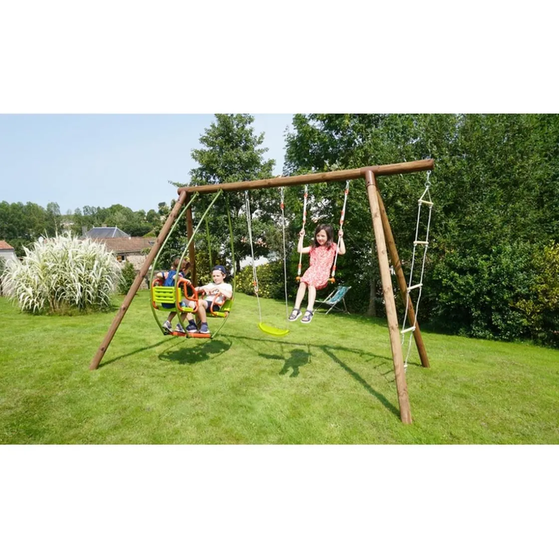 Se trata de un columpio de madera tratada con autoclave IV marrón. Es ideal para una casa con jardín, y para peques de 3 a 12 años.