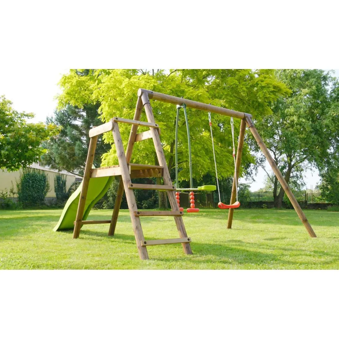 Se trata de un columpio de madera tratada con autoclave IV marrón. Es ideal para una casa con jardín, y para peques de 3 a 12 años.