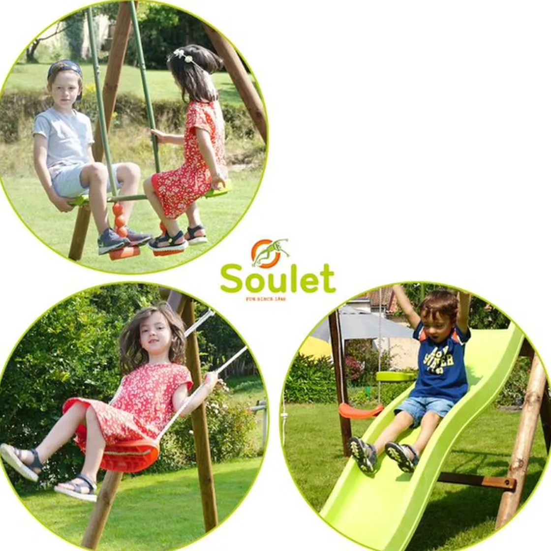 Incluye anclajes para el suelo, 1 asiento individual, 1 frente-frente, 1 tobogán, protección antipellizcos y anillas reforzadas.