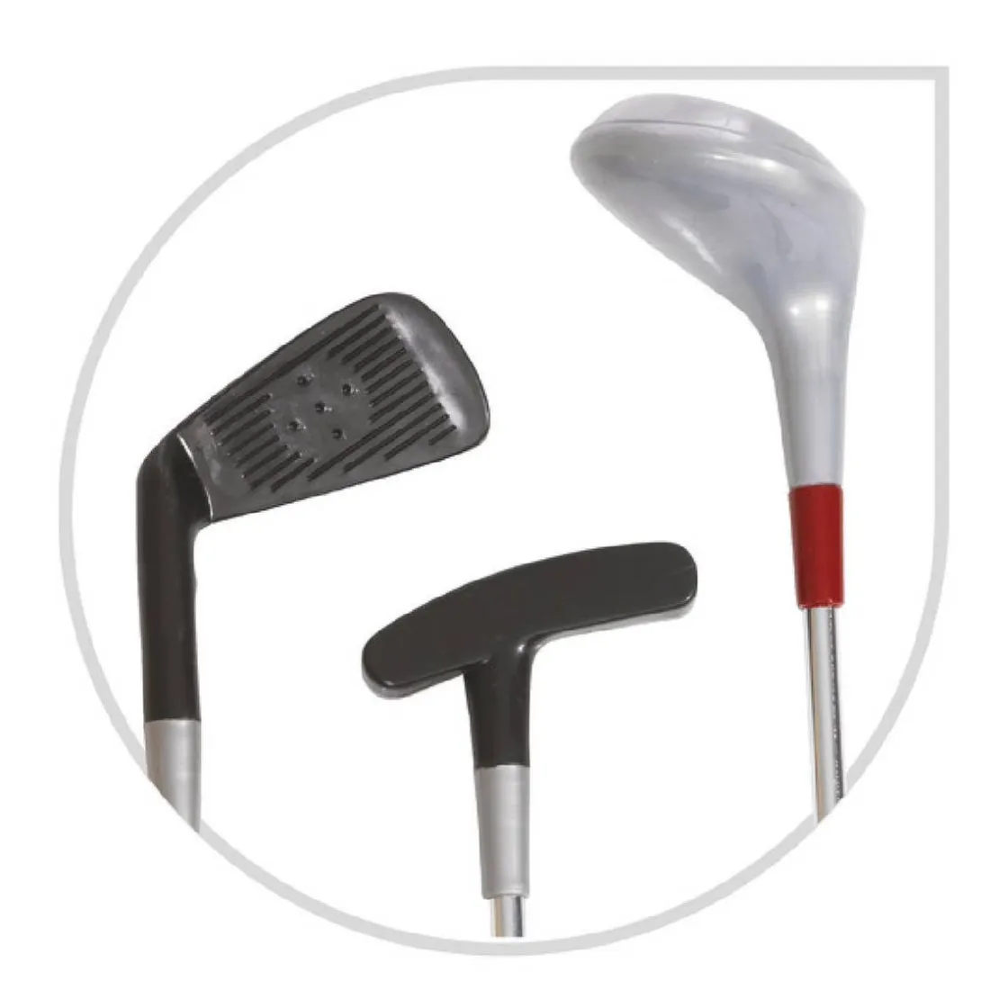 Este set incluye 3 palos, 5 tees, 1 hoyo, 1 banderín, 3 bolas y 1 bloque marcador con lápiz.
