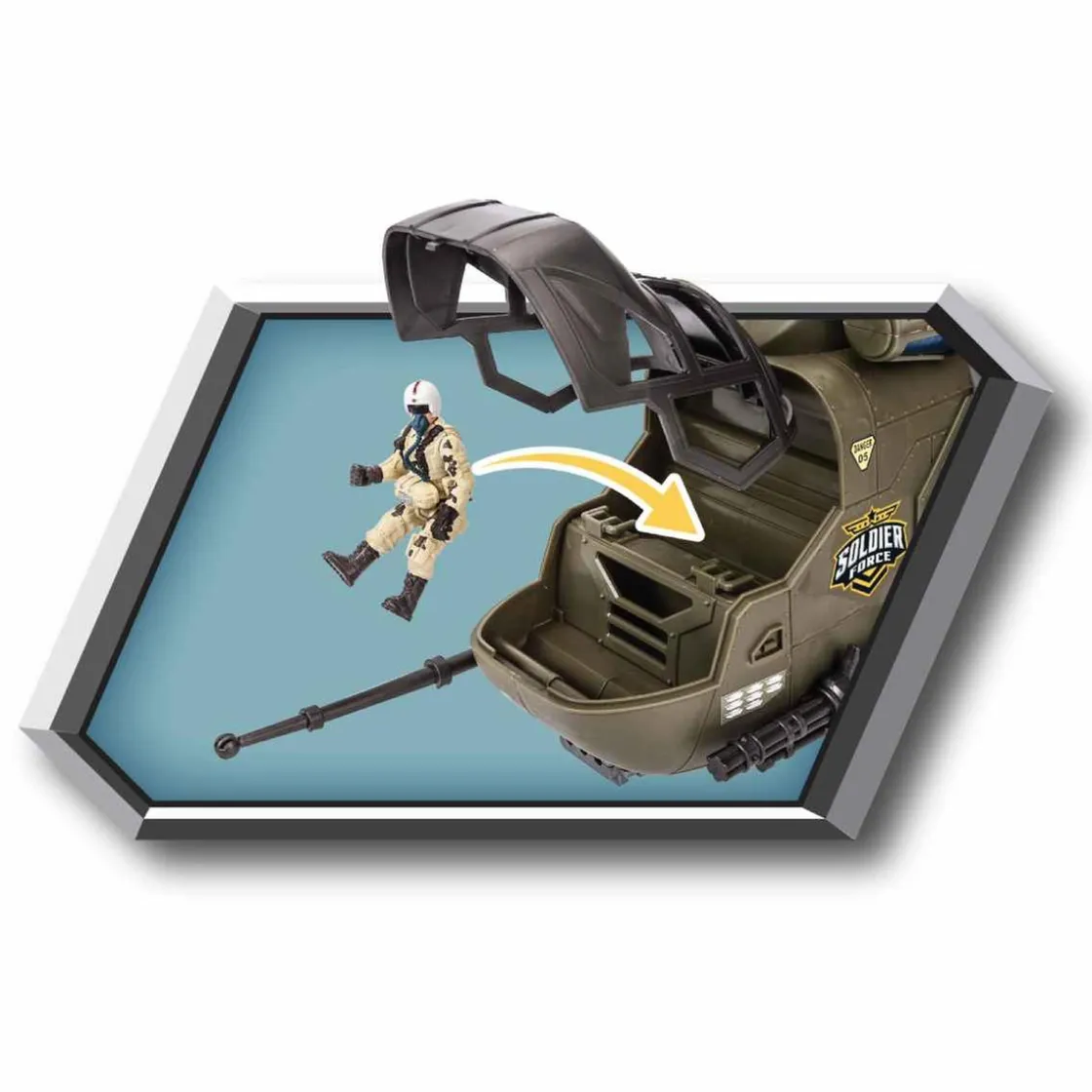 Este helicóptero de combate de 53 cm de largo aproximadamente tiene efectos de luz y sonido para mayor realismo.