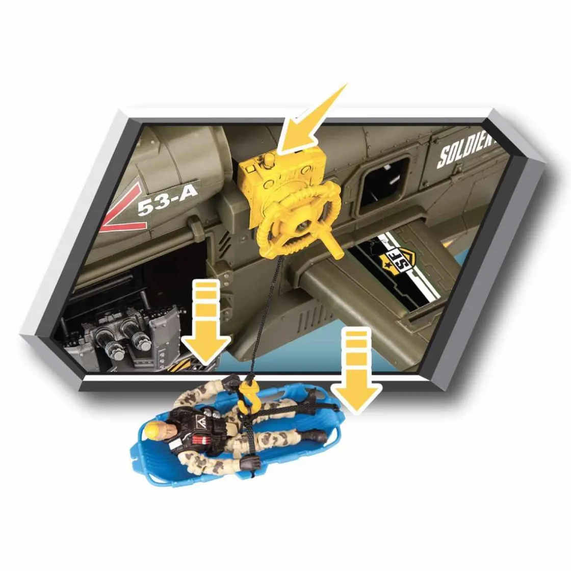 Vuela hacia nuevas aventuras con estos vehículos, 2 figuras de acción y una camilla de salvamento.