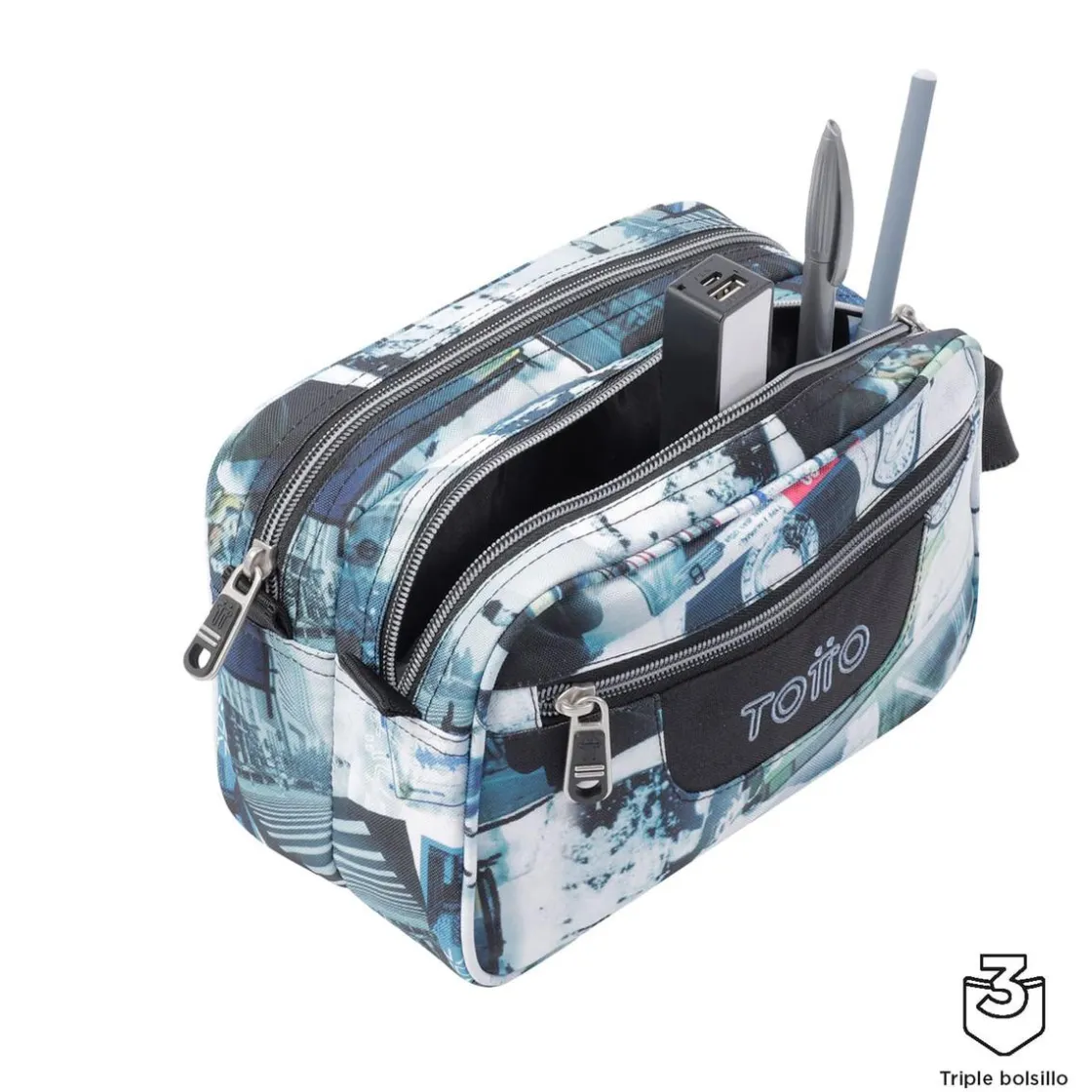 Totto – Estuche escolar tres compartimentos postales y casetes Plastilina, un estuche escolar de tres compartimentos con cremallera.