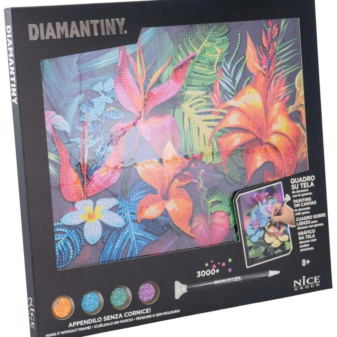 Con la guía incluida, el proceso de aplicar las gemas a cada número se convierte en una divertida aventura. La cuadrícula adhesiva de 32 x 30 cm proporciona una base perfecta para comenzar y los 3,000 cristales de colores garantizan una experiencia visual deslumbrante. Todo lo necesario está incluido: una bandeja para organizar las gemas, un bolígrafo aplicador y un cuadrado de cera.