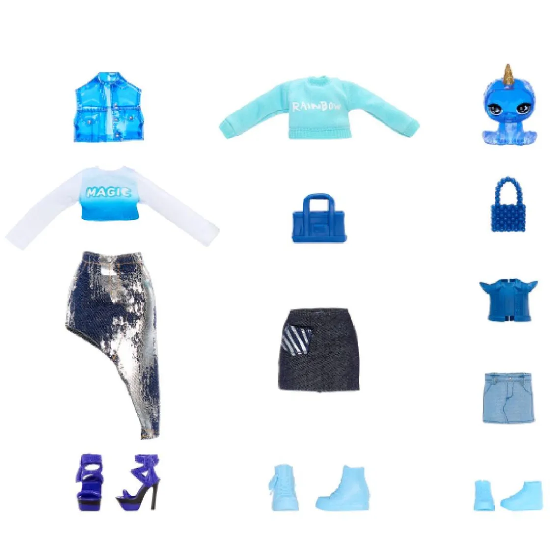 Cada muñeca luce su inconfundible tono azul y viene vestida con ropa moderna, zapatos a juego y accesorios de moda que brillan con estilo propio. Además, el pack incluye un animalito mágico azul y bolsos trendy para dar más vida a tus aventuras.