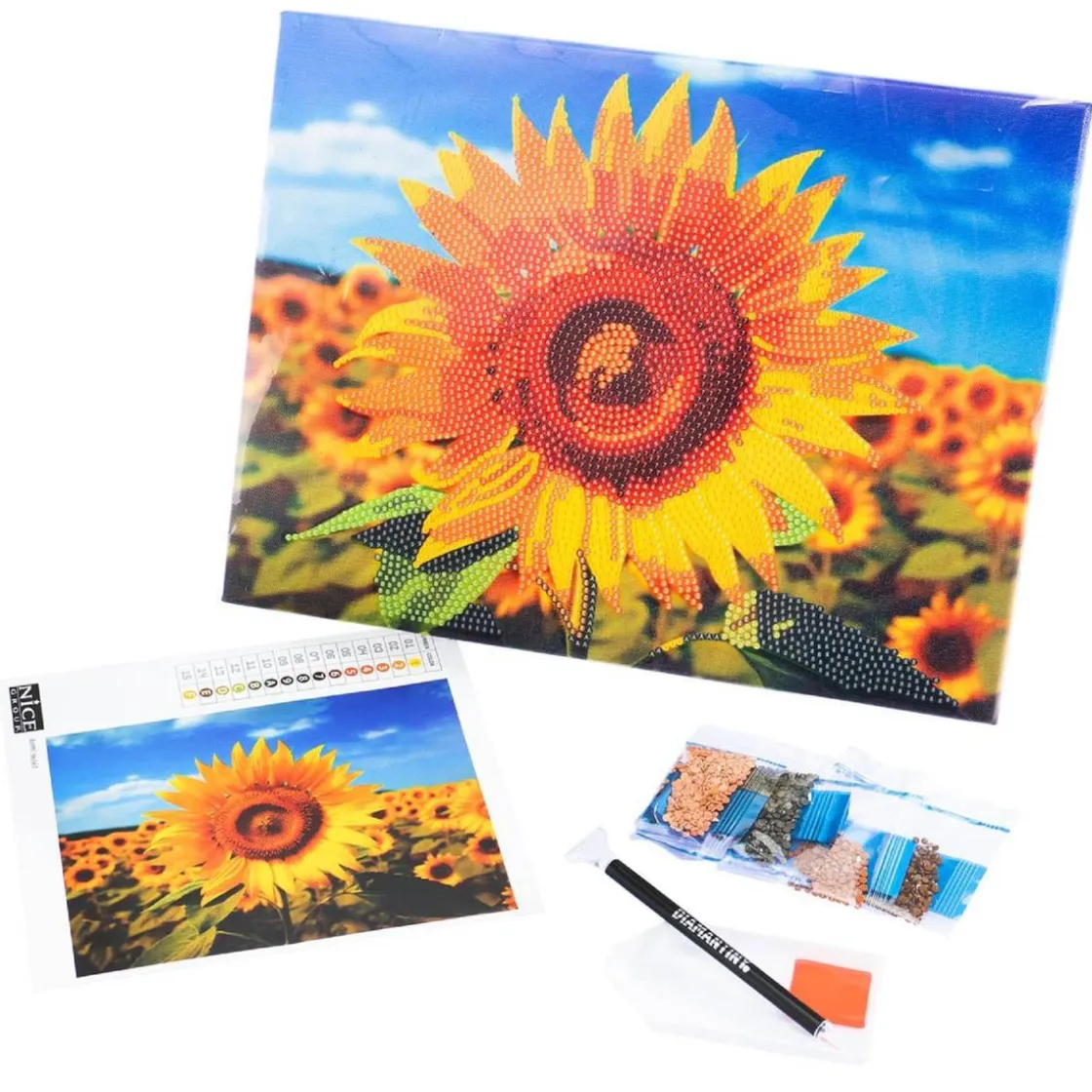 Incluye un lienzo de lona con diseño, cristales de colores, una bandeja organizadora y una práctica herramienta aplicadora. La tela sobre la que se aplican las gemas está soportada por un tablero rígido para permitir una perfecta adherencia de las gemas.